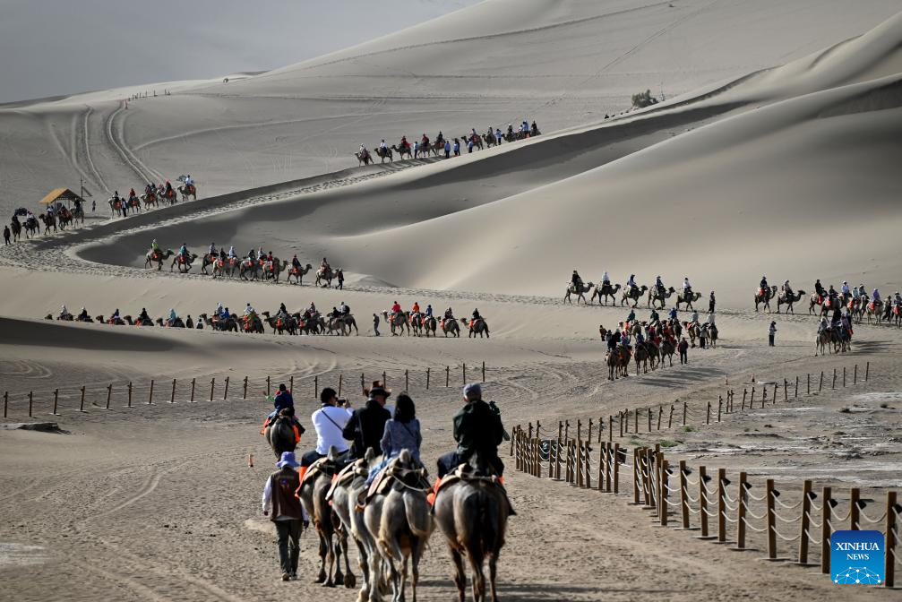 BEIJING, 2 junio, 2025 (Xinhua) -- Personas montan camellos en el área escénica de la Montaña Mingsha y el Manantial de la Luna Creciente, en Dunhuang, en la provincia de Gansu, en el noroeste de China, el 2 de junio de 2025. Personas disfrutan de los 3 días de vacaciones del Festival del Bote del Dragón, también llamado Festival Duanwu que cae el 31 de mayo este año, a través de diversas actividades en todo el país. (Xinhua/Zhang Xiaoliang)