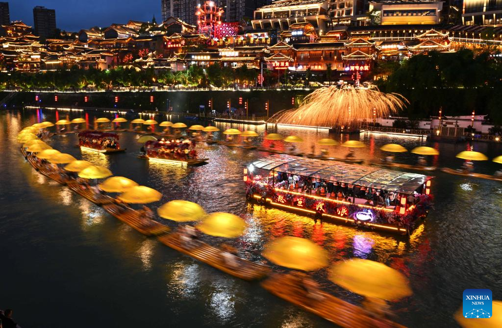 BEIJING, 2 junio, 2025 (Xinhua) -- Imagen del 1 de junio de 2025 de turistas disfrutando de la vista nocturna a lo largo del río Gongshui, en el distrito de Xuan'en, en la provincia de Hubei, en el centro de China. Personas disfrutan de los 3 días de vacaciones del Festival del Bote del Dragón, también llamado Festival Duanwu que cae el 31 de mayo este año, a través de diversas actividades en todo el país. (Xinhua/Song Wen)