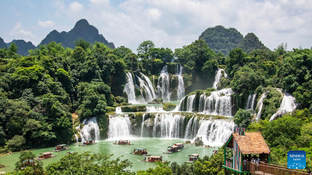BEIJING, 2 junio, 2025 (Xinhua) -- Imagen del 1 de junio de 2025 de turistas divirtiéndose en el área escénica de las Cascadas Detian, en el distrito de Daxin de la ciudad de Chongzuo, en la región autónoma zhuang de Guangxi, en el sur de China. Personas disfrutan de los 3 días de vacaciones del Festival del Bote del Dragón, también llamado Festival Duanwu que cae el 31 de mayo este año, a través de diversas actividades en todo el país. (Xinhua/Zhao Jingwu)