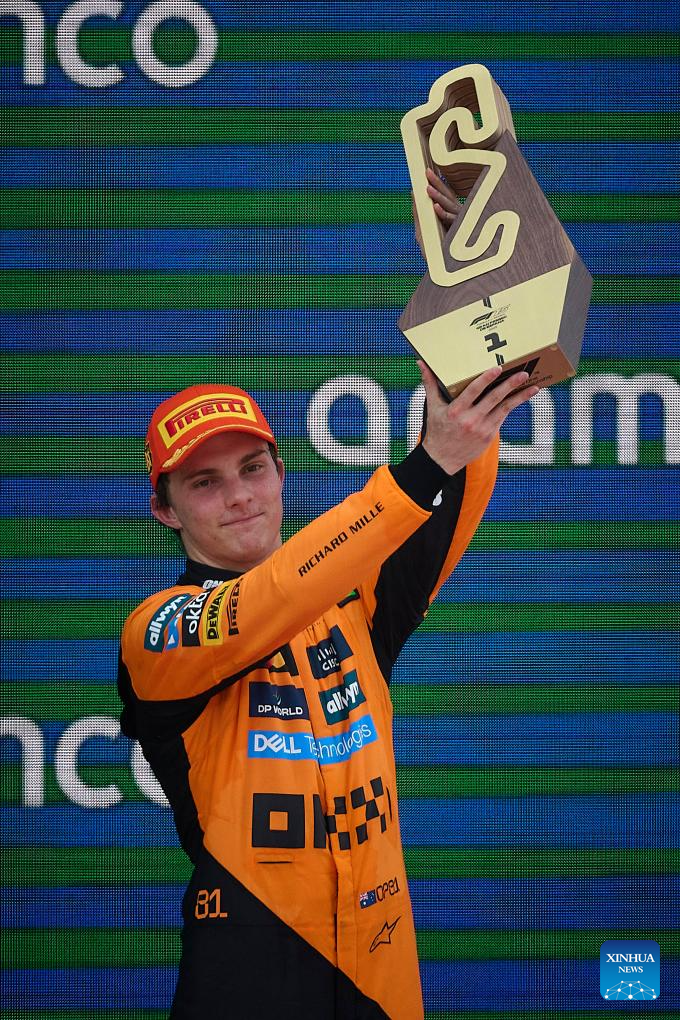 MONTMELO, 2 junio, 2025 (Xinhua) -- Imagen del 1 de junio de 2025 del ganador del primer lugar, el piloto australiano de la escudería McLaren, Oscar Piastri, festejando en el podio después del Gran Premio de España de Fórmula Uno 2025, en el Circuito de Cataluña, en Montmeló, cerca de Barcelona, España. (Xinhua/Pablo Morano)