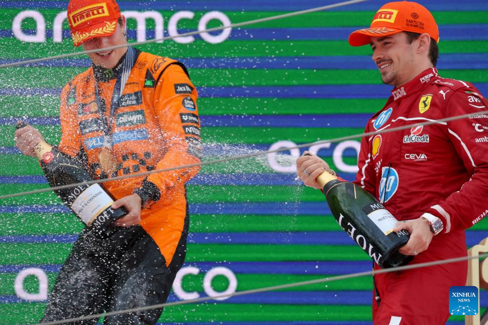 MONTMELO, 2 junio, 2025 (Xinhua) -- Imagen del 1 de junio de 2025 del ganador del primer lugar, el piloto australiano de la escudería McLaren, Oscar Piastri (i), festejando en el podio con el ganador del tercer lugar, el piloto monegasco de la escudería Ferrari, Charles Leclerc, después del Gran Premio de España de Fórmula Uno 2025, en el Circuito de Cataluña, en Montmeló, cerca de Barcelona, España. (Xinhua/Bao Di)