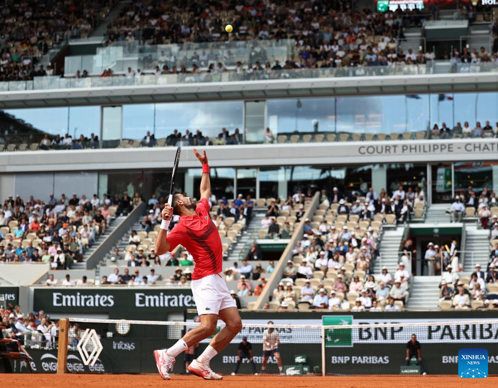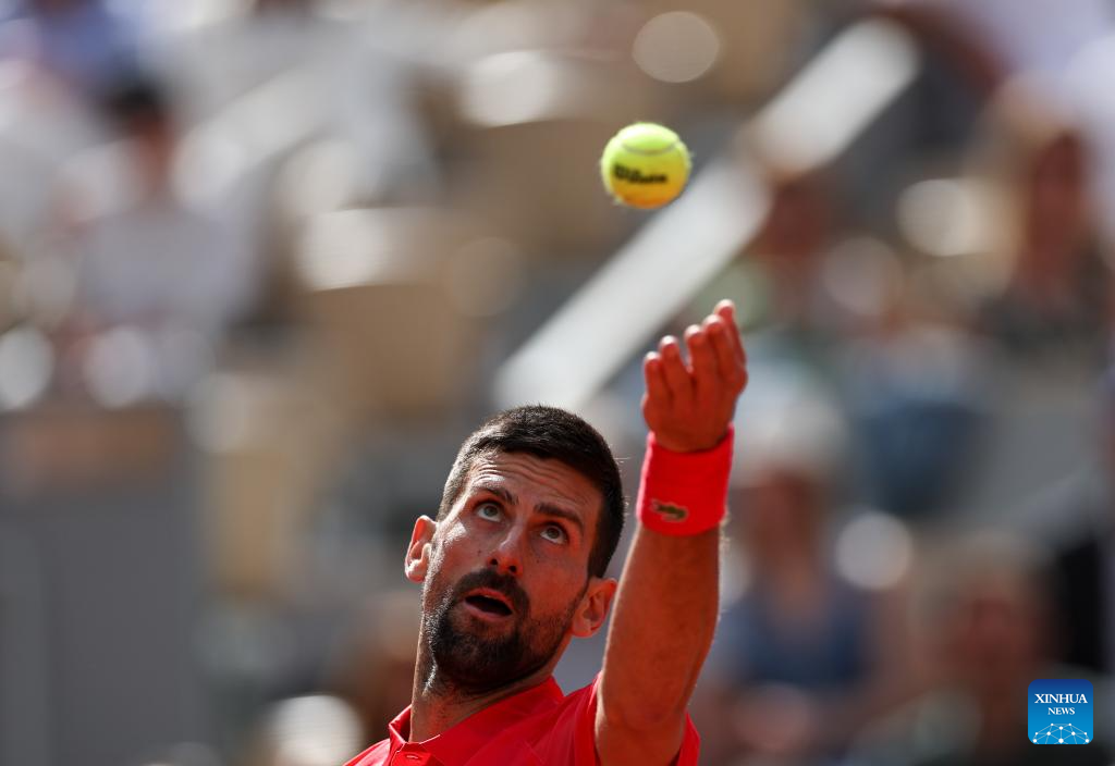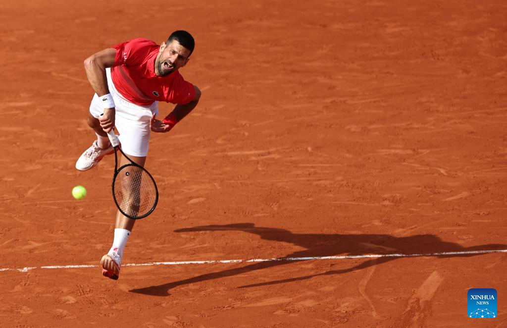 PARíS, 3 junio, 2025 (Xinhua) -- Imagen del 2 de junio de 2025 de Novak Djokovic, de Serbia, sirviendo la pelota a Cameron Norrie, de Reino Unido, durante el partido de cuarta ronda de individuales masculinos en el torneo de tenis Abierto de Francia, en Roland Garros, en París, Francia. (Xinhua/Li Jing)