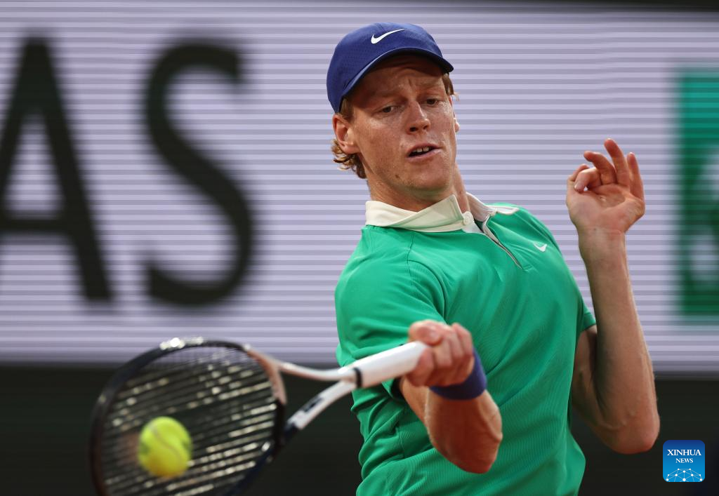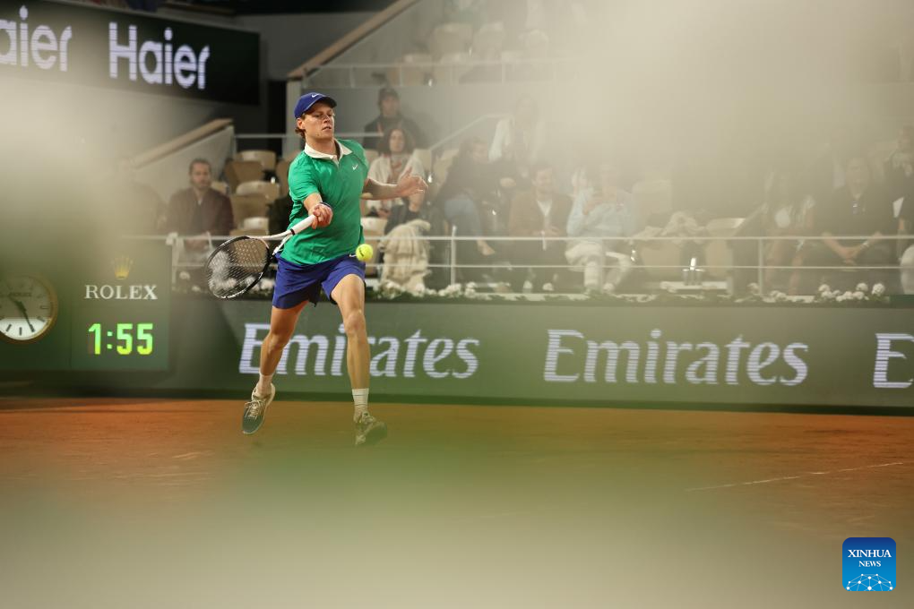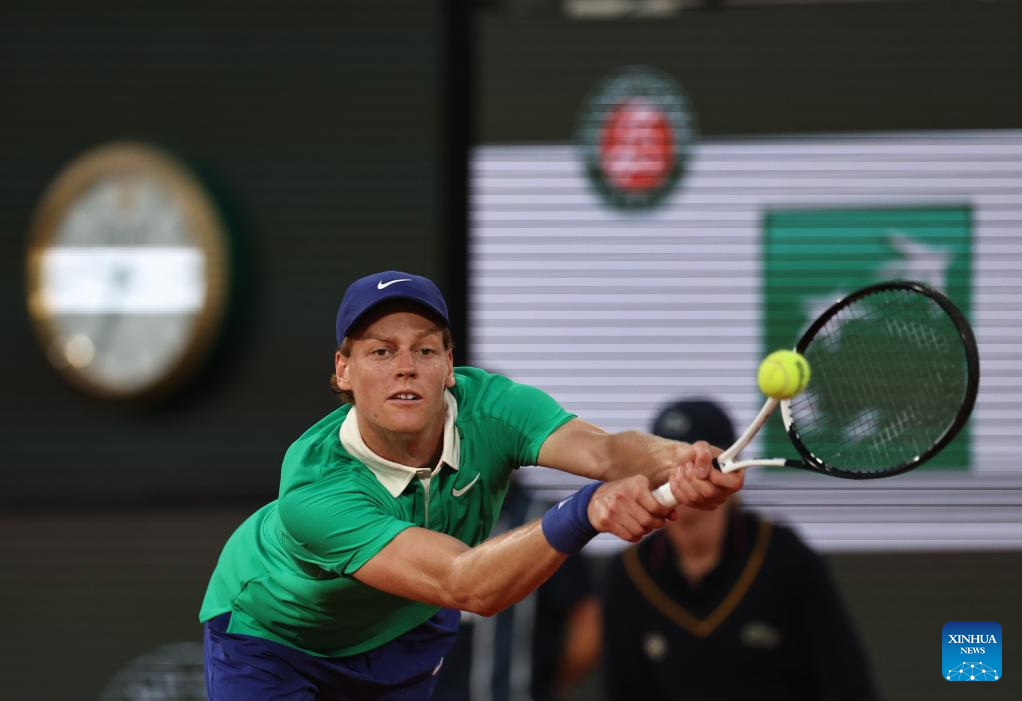 PARÍS, 3 junio, 2025 (Xinhua) -- Imagen del 2 de junio de 2025 de Jannik Sinner, de Italia, devolviendo la pelota durante el partido de cuarta ronda de individuales masculinos ante Andrey Rublev, de Rusia, en el torneo de tenis Abierto de Francia, en Roland Garros, en París, Francia. (Xinhua/Li Jing)