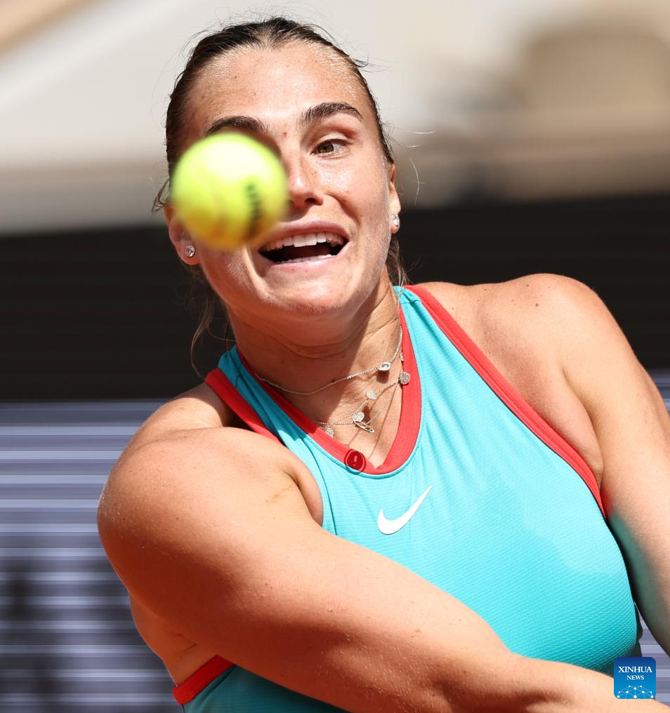 PARÍS, 3 junio, 2025 (Xinhua) -- Aryna Sabalenka devuelve la pelota durante los cuartos de final de individuales femeninos entre Zheng Qinwen, de China, y Aryna Sabalenka, de Bielorrusia, en el torneo de tenis Abierto de Francia, en Roland Garros, en París, Francia, el 3 de junio de 2025. (Xinhua/Li Jing)