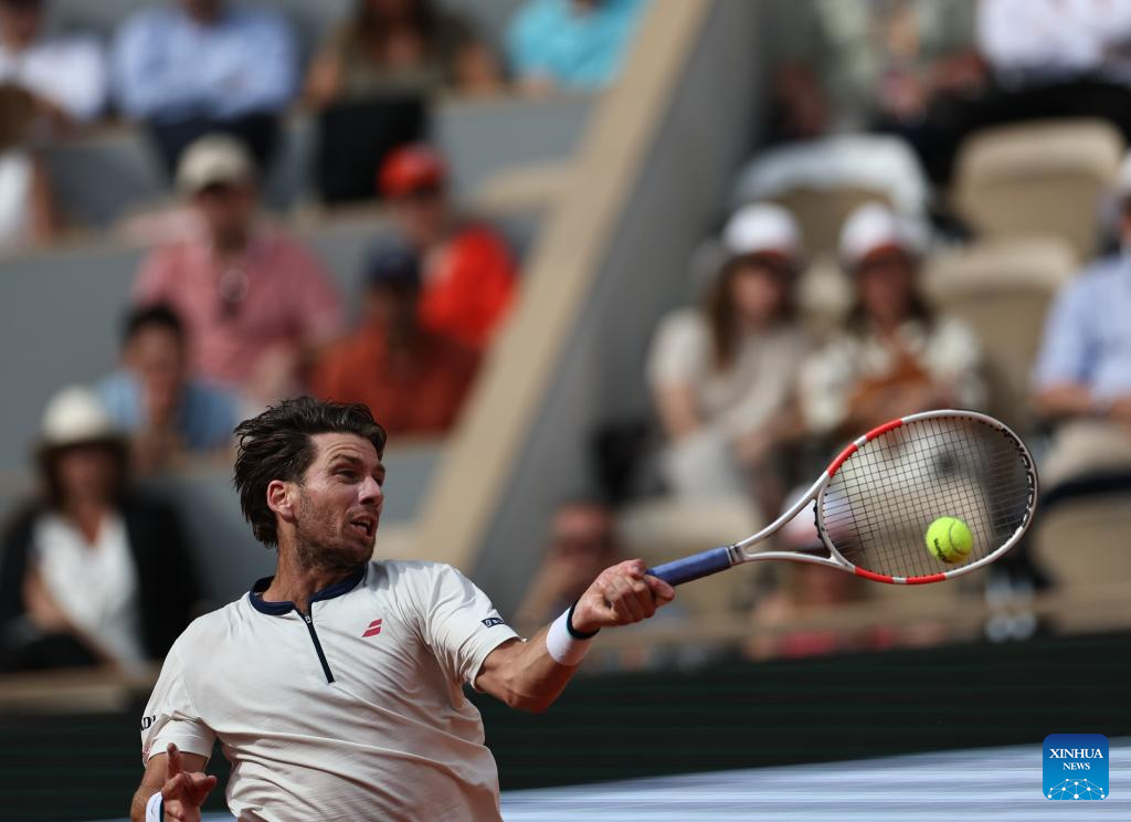 PARíS, 3 junio, 2025 (Xinhua) -- Imagen del 2 de junio de 2025 de Cameron Norrie, de Reino Unido, devolviendo la pelota a Novak Djokovic, de Serbia, durante el partido de cuarta ronda de individuales masculinos en el torneo de tenis Abierto de Francia, en Roland Garros, en París, Francia. (Xinhua/Li Jing)