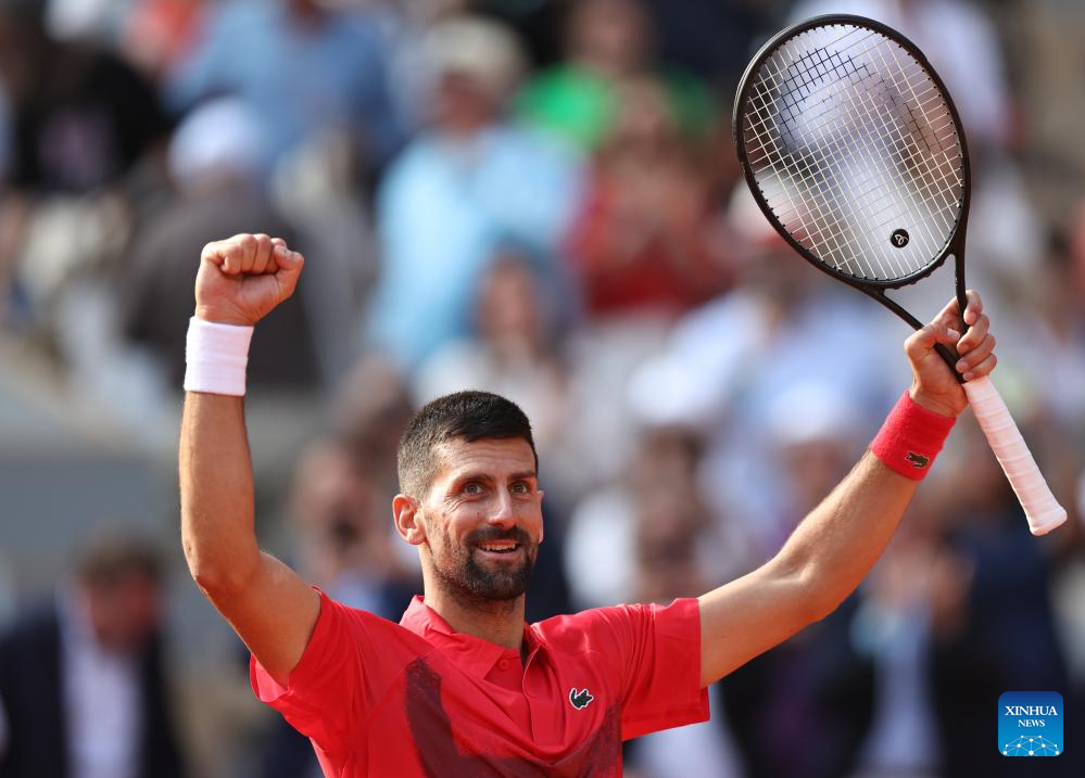 PARíS, 3 junio, 2025 (Xinhua) -- Imagen del 2 de junio de 2025 de Novak Djokovic, de Serbia, festejando la victoria ante Cameron Norrie, de Reino Unido, al término del partido de cuarta ronda de individuales masculinos en el torneo de tenis Abierto de Francia, en Roland Garros, en París, Francia. (Xinhua/Li Jing)