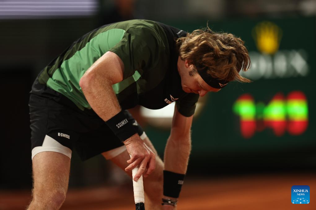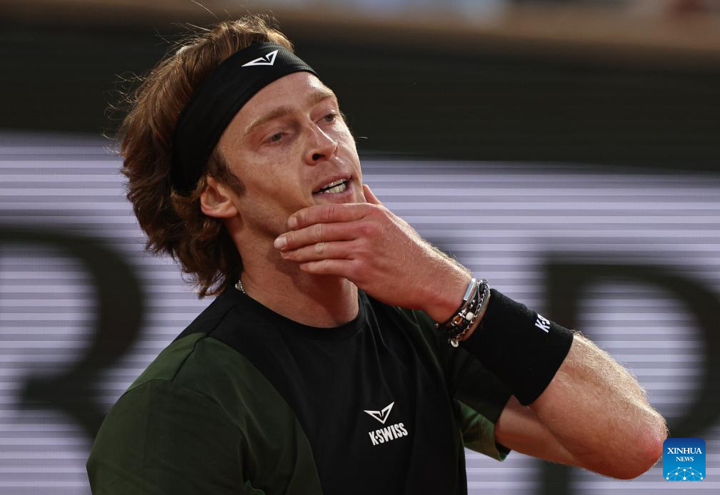 PARÍS, 3 junio, 2025 (Xinhua) -- Imagen del 2 de junio de 2025 de Andrey Rublev, de Rusia, reaccionando después de perder un punto durante el partido de cuarta ronda de individuales masculinos ante Jannik Sinner, de Italia, en el torneo de tenis Abierto de Francia, en Roland Garros, en París, Francia. (Xinhua/Li Jing)