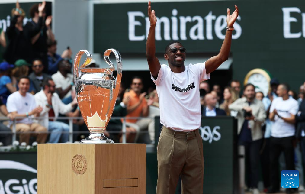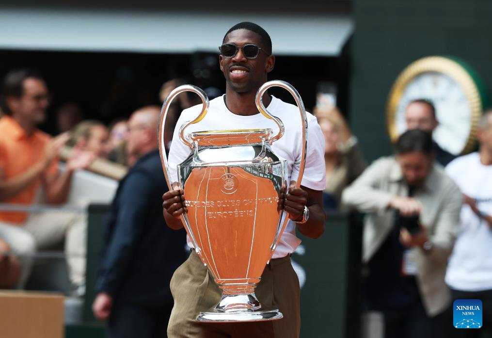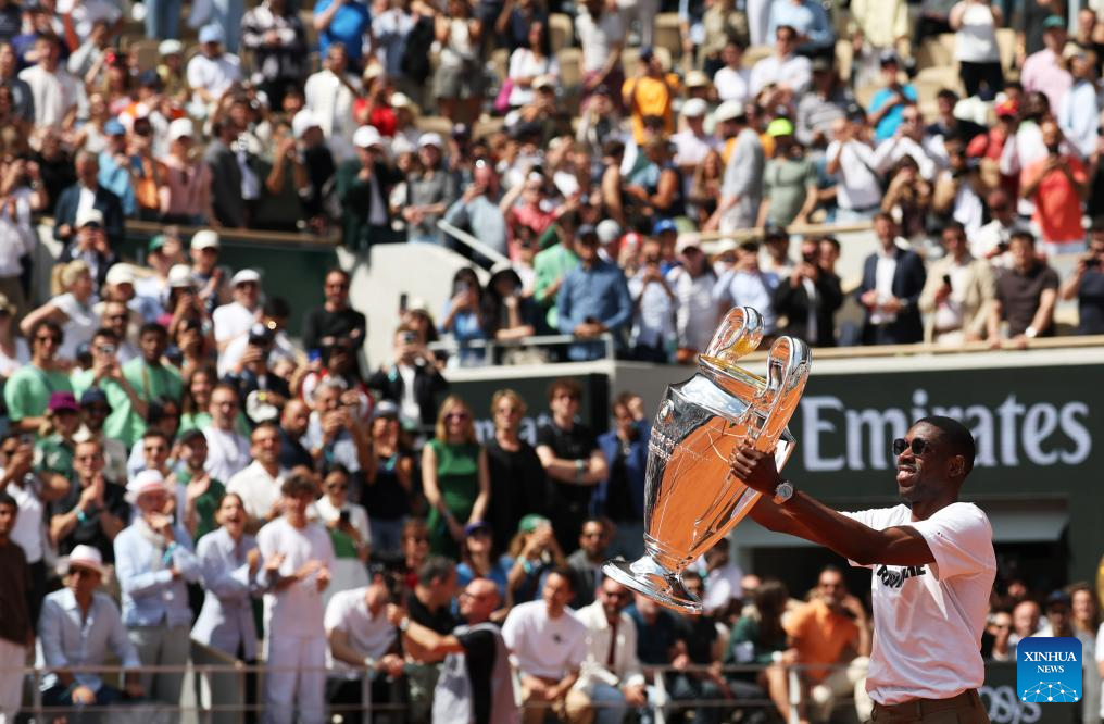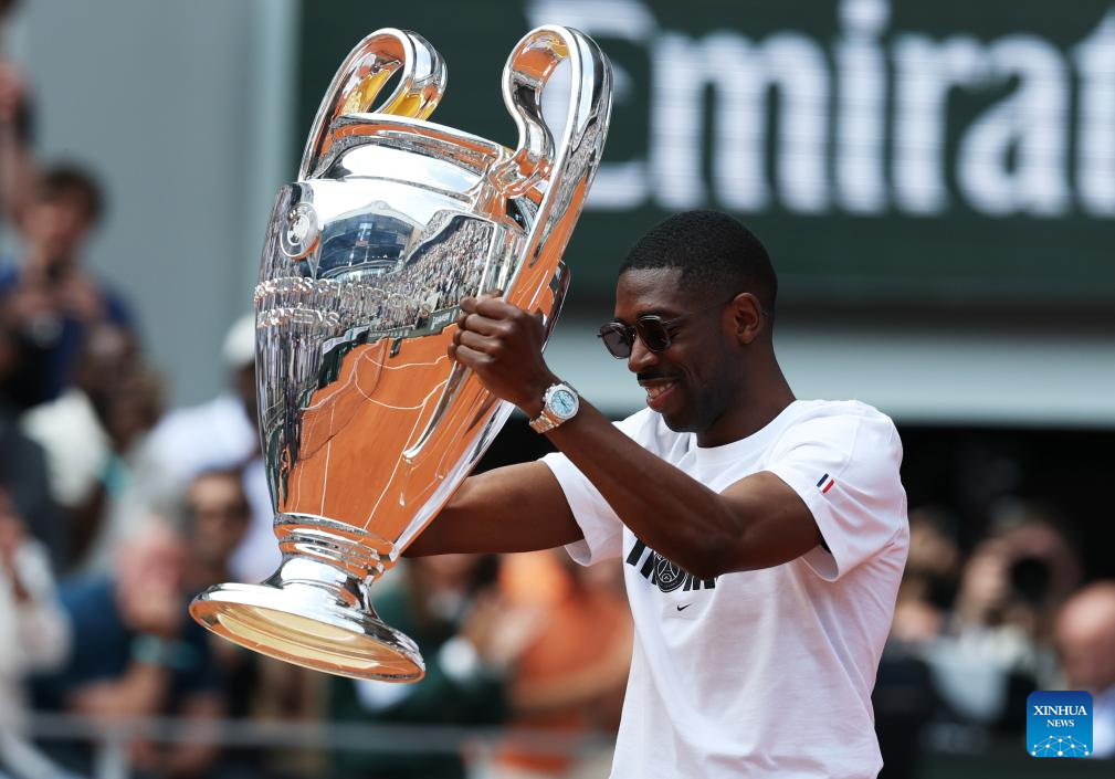 PARÍS, 3 junio, 2025 (Xinhua) -- Imagen del 2 de junio de 2025 del delantero francés, Ousmane Dembele, de Paris Saint-Germain, saludando a los espectadores mientras presenta el trofeo de la Liga de Campeones de la UEFA en la cancha Philippe Chatrier en el torneo de tenis Abierto de Francia, en Roland Garros, en París, Francia. (Xinhua/Gao Jing)