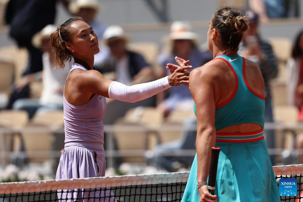 PARÍS, 3 junio, 2025 (Xinhua) -- Zheng Qinwen (i), de China, y Aryna Sabalenka, de Bielorrusia, se saludan al término de los cuartos de final de individuales femeninos en el torneo de tenis Abierto de Francia, en Roland Garros, en París, Francia, el 3 de junio de 2025. (Xinhua/Li Jing)