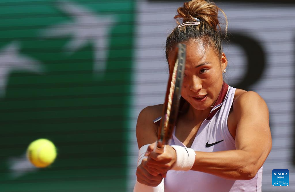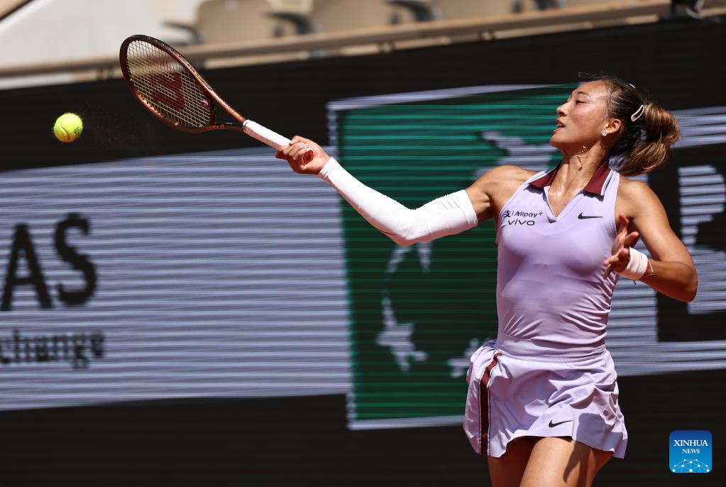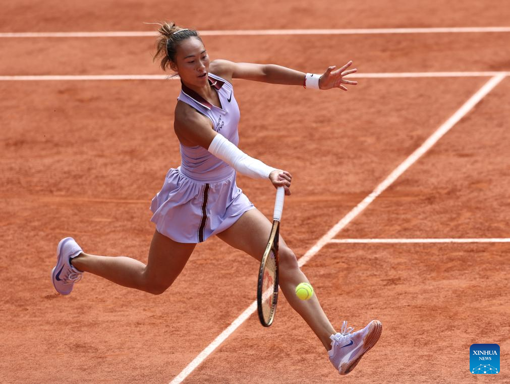 PARÍS, 3 junio, 2025 (Xinhua) -- Zheng Qinwen devuelve la pelota durante los cuartos de final de individuales femeninos entre Zheng Qinwen, de China, y Aryna Sabalenka, de Bielorrusia, en el torneo de tenis Abierto de Francia, en Roland Garros, en París, Francia, el 3 de junio de 2025. (Xinhua/Li Jing)