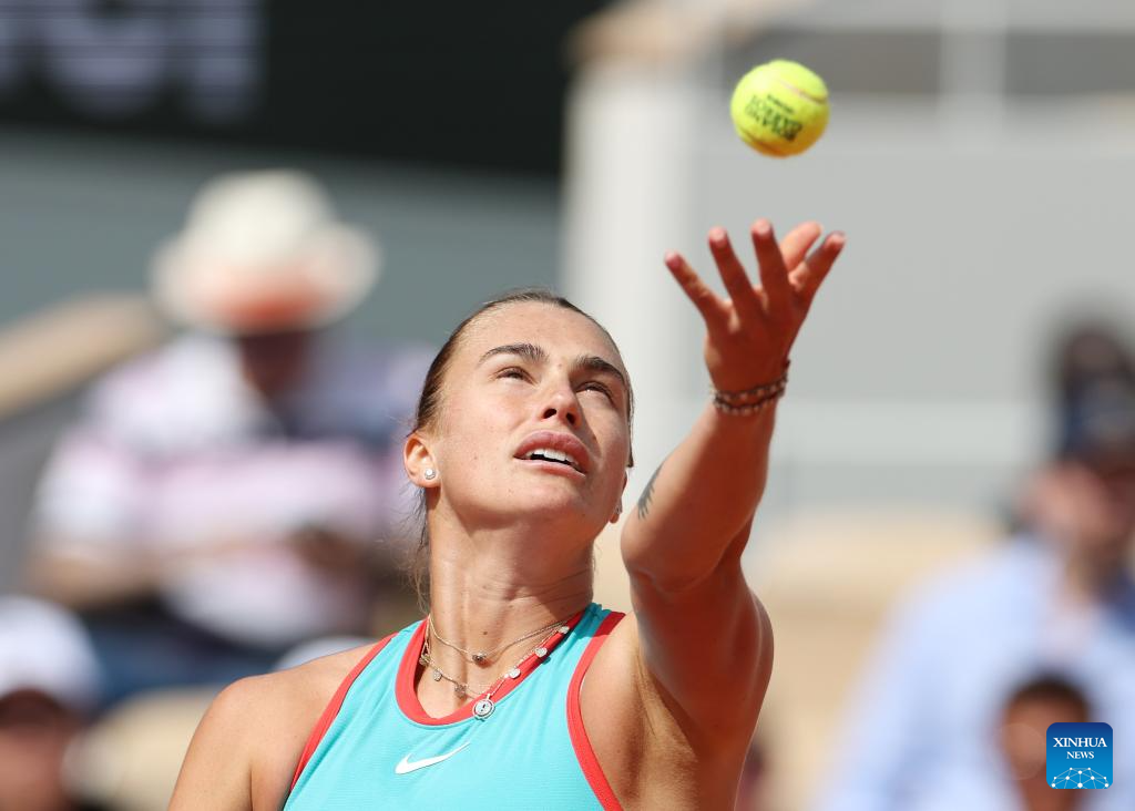 PARÍS, 3 junio, 2025 (Xinhua) -- Aryna Sabalenka sirve la pelota durante los cuartos de final de individuales femeninos entre Zheng Qinwen, de China, y Aryna Sabalenka, de Bielorrusia, en el torneo de tenis Abierto de Francia, en Roland Garros, en París, Francia, el 3 de junio de 2025. (Xinhua/Gao Jing)