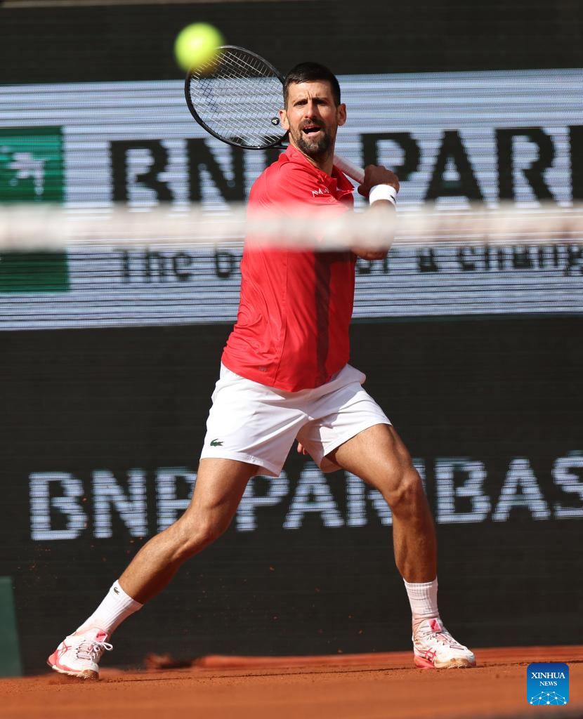 PARíS, 3 junio, 2025 (Xinhua) -- Imagen del 2 de junio de 2025 de Novak Djokovic, de Serbia, devolviendo la pelota a Cameron Norrie, de Reino Unido, durante el partido de cuarta ronda de individuales masculinos en el torneo de tenis Abierto de Francia, en Roland Garros, en París, Francia. (Xinhua/Li Jing)