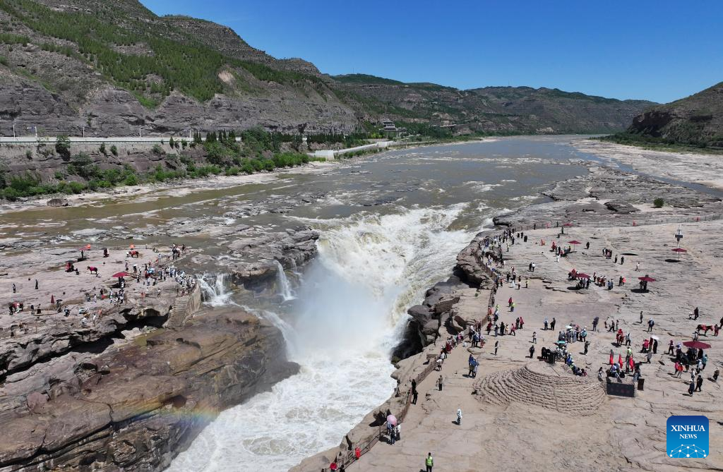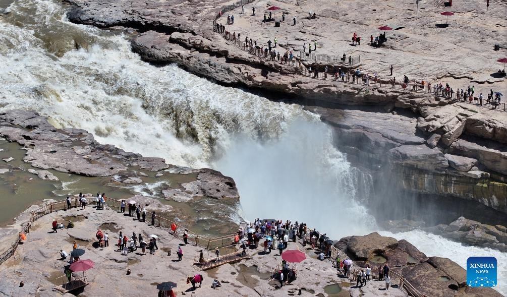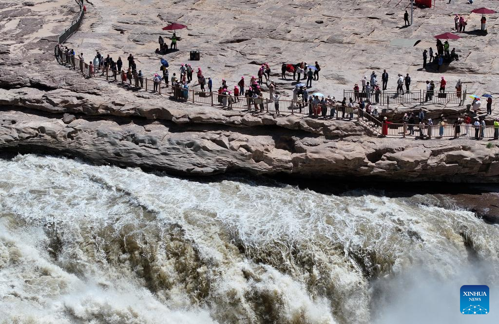 YICHUAN, 4 junio, 2025 (Xinhua) -- Vista aérea tomada con un dron el 4 de junio de 2025 de turistas visitando la cascada Hukou en el río Amarillo, en la frontera entre las provincias de Shanxi, en el norte de China, y Shaanxi, en el noroeste de China. (Xinhua/Zhang Bowen)