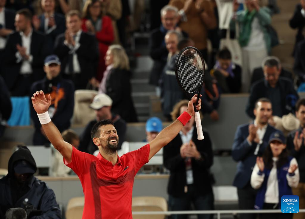 PARIS, 5 junio, 2025 (Xinhua) -- Imagen del 4 de junio de 2025 de Novak Djokovic festejando después de ganar el partido de cuartos de final de individuales masculinos entre Alexander Zverev, de Alemania, y Novak Djokovic, de Serbia, en el torneo de tenis Abierto de Francia, en Roland Garros, en París, Francia. (Xinhua/Li Jing)
