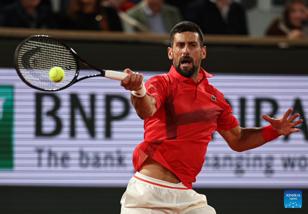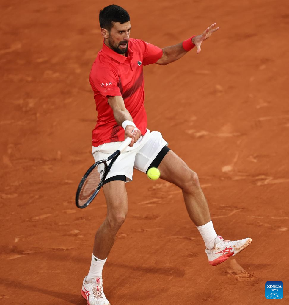PARIS, 5 junio, 2025 (Xinhua) -- Imagen del 4 de junio de 2025 de Novak Djokovic devolviendo la pelota durante el partido de cuartos de final de individuales masculinos entre Alexander Zverev, de Alemania, y Novak Djokovic, de Serbia, en el torneo de tenis Abierto de Francia, en Roland Garros, en París, Francia. (Xinhua/Li Jing)