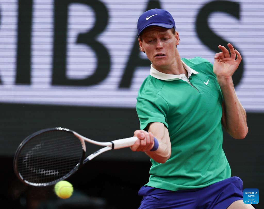 PARIS, 5 junio, 2025 (Xinhua) -- Imagen del 4 de junio de 2025 de Jannik Sinner devolviendo la pelota durante el partido de cuartos de final de individuales masculinos entre Jannik Sinner, de Italia, y Alexander Bublik, de Kazajistán, en el torneo de tenis Abierto de Francia, en Roland Garros, en París, Francia. (Xinhua/Li Jing)