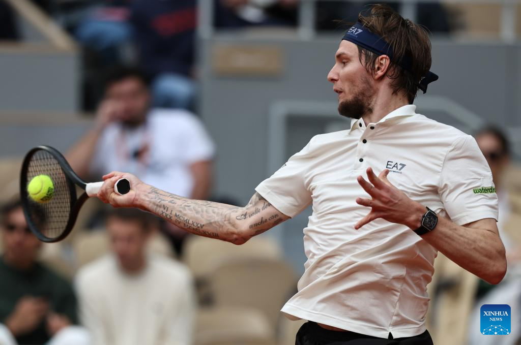 PARIS, 5 junio, 2025 (Xinhua) -- Imagen del 4 de junio de 2025 de Alexander Bublik devolviendo la pelota durante el partido de cuartos de final de individuales masculinos entre Jannik Sinner, de Italia, y Alexander Bublik, de Kazajistán, en el torneo de tenis Abierto de Francia, en Roland Garros, en París, Francia. (Xinhua/Li Jing)