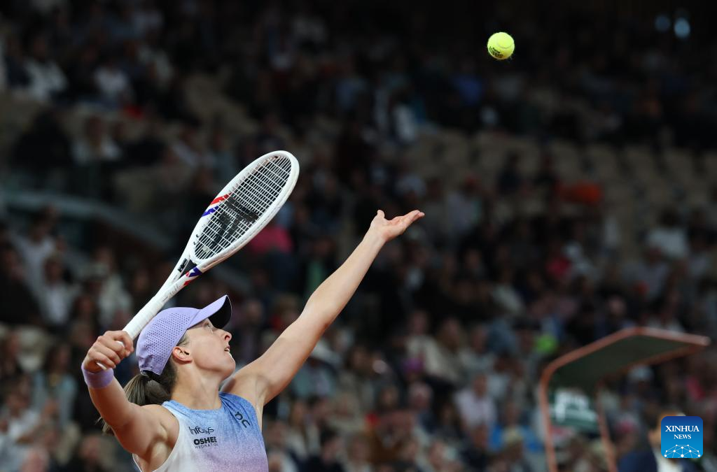 PARIS, 5 junio, 2025 (Xinhua) -- Iga Swiatek sirve la pelota durante la semifinal de individuales femeninos entre Aryna Sabalenka, de Bielorrusia, e Iga Swiatek, de Polonia, en el torneo de tenis Abierto de Francia, en Roland Garros, en París, Francia, el 5 de junio de 2025. (Xinhua/Gao Jing)