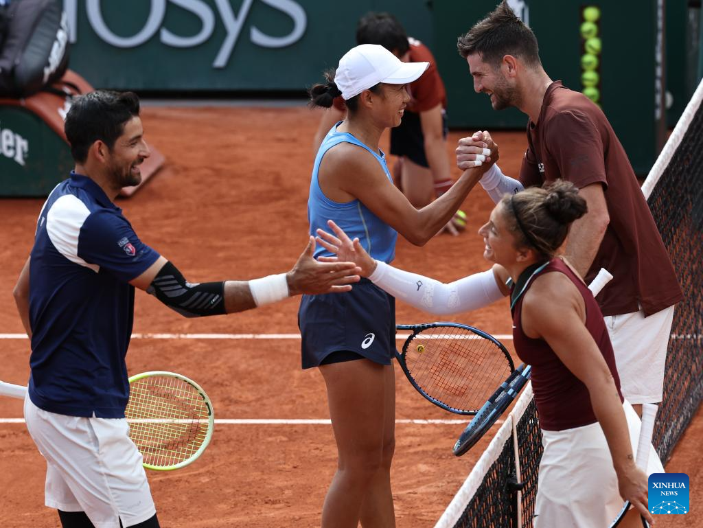PARIS, 5 junio, 2025 (Xinhua) -- Imagen del 4 de junio de 2025 de Zhang Shuai (2-i)/Marcelo Arévalo (i) y Sara Errani (2-d)/Andrea Vavassori, estrechando las manos al término del partido de semifinal de dobles mixtos entre Zhang Shuai, de China/Marcelo Arévalo, de El Salvador, y Sara Errani/Andrea Vavassori, de Italia, en el torneo de tenis Abierto de Francia, en Roland Garros, en París, Francia. (Xinhua/Li Jing)