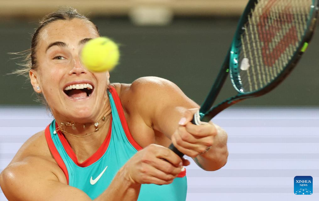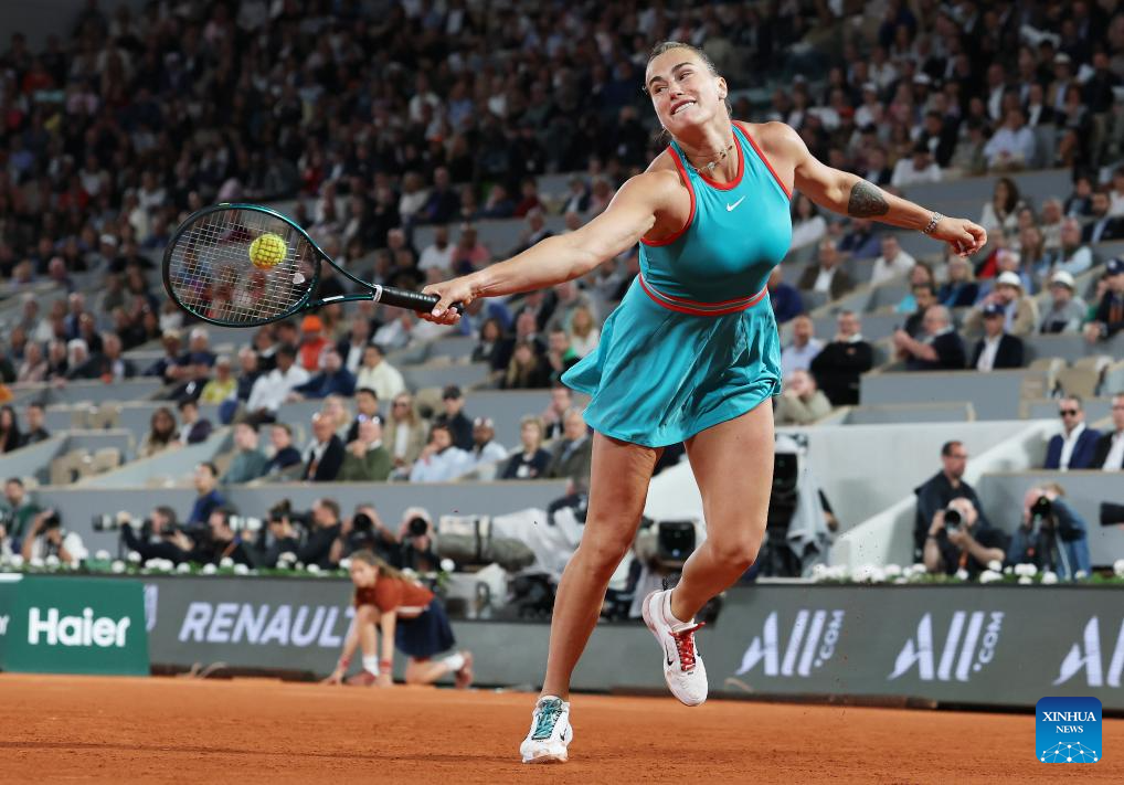 PARIS, 5 junio, 2025 (Xinhua) -- Aryna Sabalenka devuelve la pelota durante la semifinal de individuales femeninos entre Aryna Sabalenka, de Bielorrusia, e Iga Swiatek, de Polonia, en el torneo de tenis Abierto de Francia, en Roland Garros, en París, Francia, el 5 de junio de 2025. (Xinhua/Gao Jing)