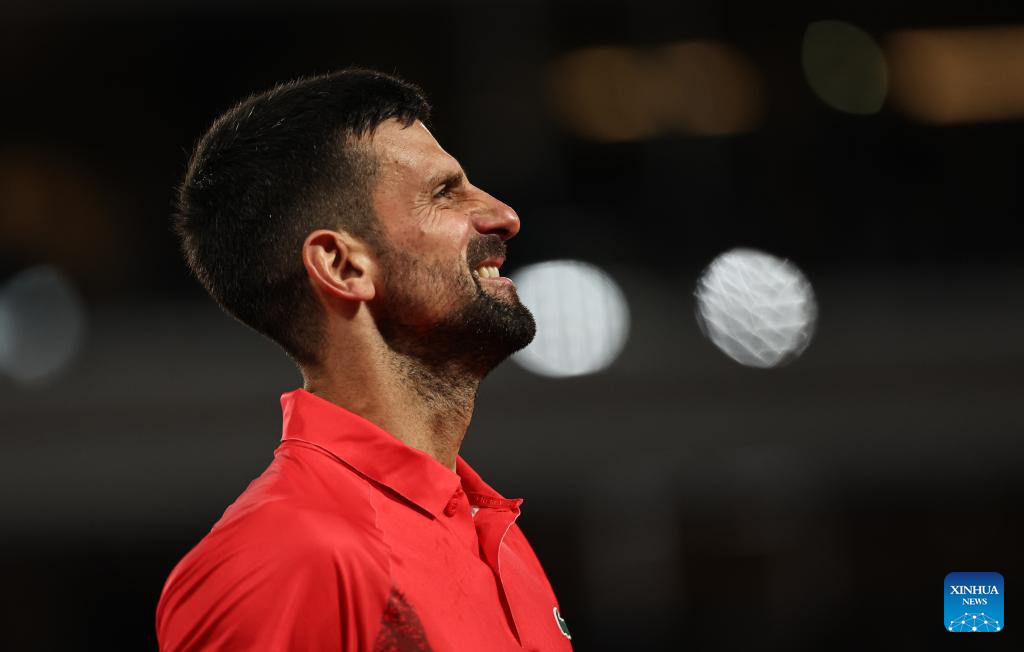 PARIS, 5 junio, 2025 (Xinhua) -- Imagen del 4 de junio de 2025 de Novak Djokovic festejando un punto durante el partido de cuartos de final de individuales masculinos entre Alexander Zverev, de Alemania, y Novak Djokovic, de Serbia, en el torneo de tenis Abierto de Francia, en Roland Garros, en París, Francia. (Xinhua/Li Jing)