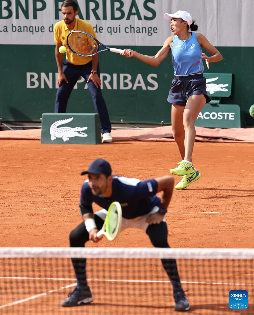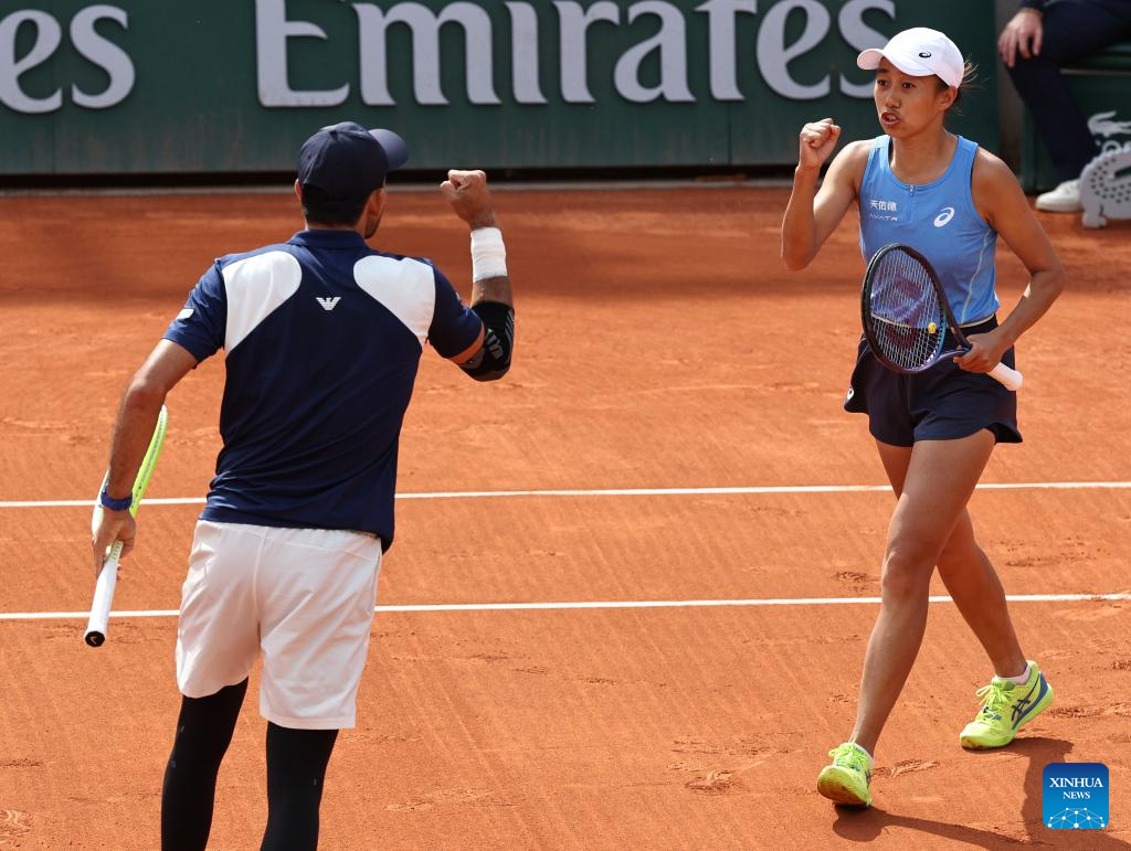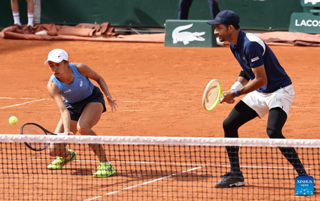 PARIS, 5 junio, 2025 (Xinhua) -- Imagen del 4 de junio de 2025 de Zhang Shuai (i)/Marcelo Arévalo compitiendo durante el partido de semifinal de dobles mixtos entre Zhang Shuai, de China/Marcelo Arévalo, de El Salvador, y Sara Errani/Andrea Vavassori, de Italia, en el torneo de tenis Abierto de Francia, en Roland Garros, en París, Francia. (Xinhua/Li Jing)