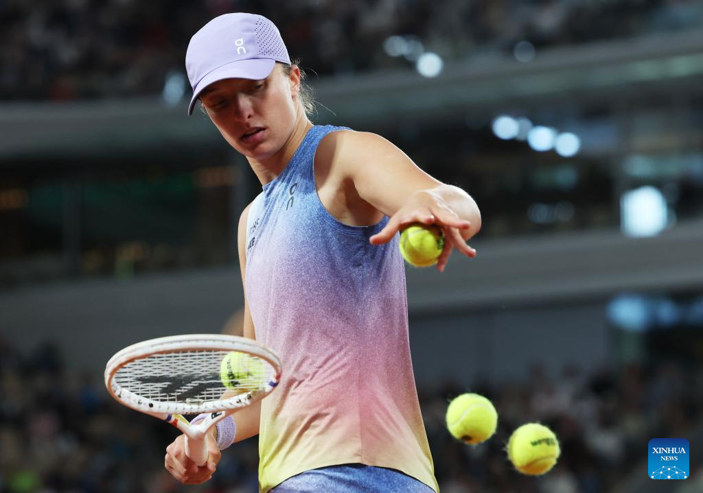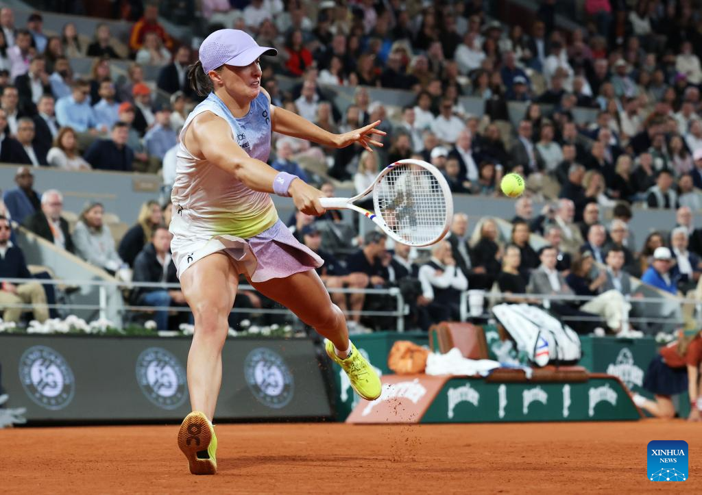 PARIS, 5 junio, 2025 (Xinhua) -- Iga Swiatek devuelve la pelota durante la semifinal de individuales femeninos entre Aryna Sabalenka, de Bielorrusia, e Iga Swiatek, de Polonia, en el torneo de tenis Abierto de Francia, en Roland Garros, en París, Francia, el 5 de junio de 2025. (Xinhua/Gao Jing)