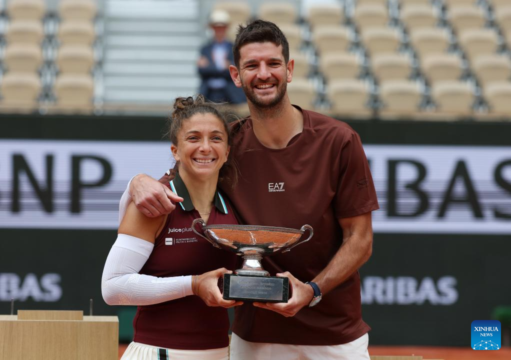 PARIS, 5 junio, 2025 (Xinhua) -- Sara Errani (i)/Andrea Vavassori festejan durante la ceremonia de premiación al término del partido de la final de dobles mixtos entre Taylor Townsend/Evan King, de Estados Unidos, y Sara Errani/Andrea Vavassori, de Italia, en el torneo de tenis Abierto de Francia, en Roland Garros, en París, Francia, el 5 de junio de 2025. (Xinhua/Gao Jing)
