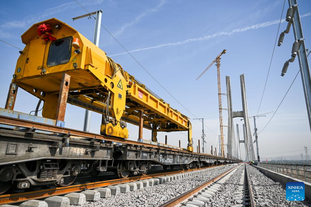 WUHAI, 6 junio, 2025 (Xinhua) -- Una máquina de colocación de rieles de acero opera en el sitio de construcción del gran puente del río Amarillo de Wuhai, en la región autónoma de Mongolia Interior, en el norte de China, el 6 de junio de 2025. Con la colocación precisa del último juego de rieles de acero de 500 metros de longitud, la fase de tendido de vías del tramo de Mongolia Interior del proyecto del ferrocarril de alta velocidad Baotou-Yinchuan finalizó con éxito el viernes. Con una velocidad diseñada de 250 kilómetros por hora el ferrocarril de alta velocidad Baotou-Yinchuan es un enlace crucial a lo largo de la línea troncal horizontal Beijing-Lanzhou en la red ferroviaria nacional de alta velocidad. (Xinhua/Lian Zhen)