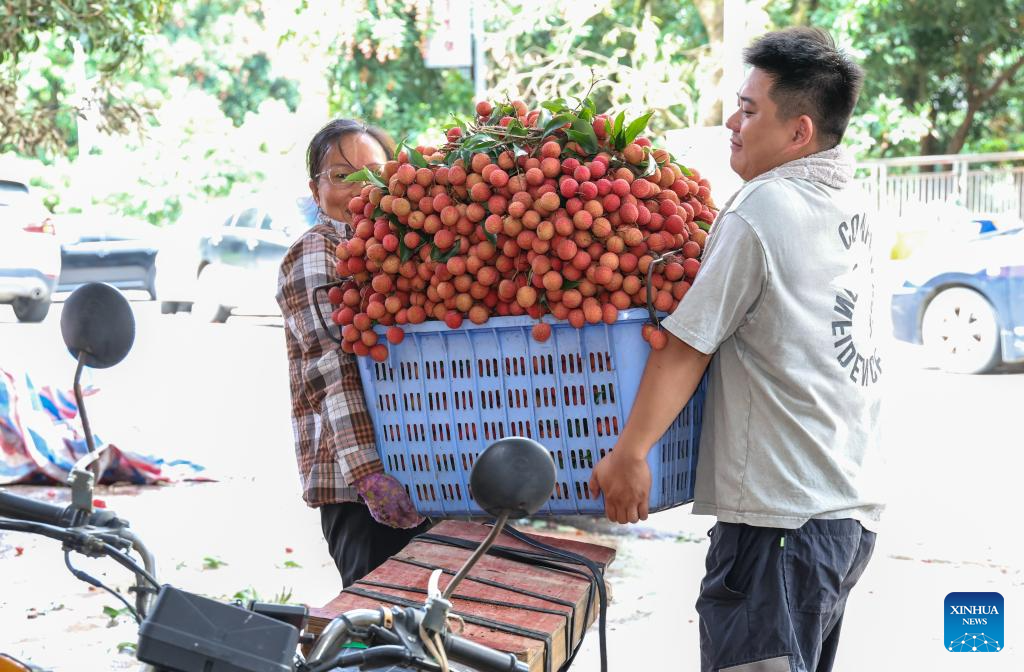 MAOMING, 7 junio, 2025 (Xinhua) -- Imagen del 5 de junio de 2025 de agricultores transportando lichis recién cosechados, en la aldea de Baiqiao, en Gaozhou de la ciudad de Maoming, en la provincia de Guangdong, en el sur de China. Enclavada en los exuberantes paisajes del suroeste de la provincia de Guangdong, Gaozhou de la ciudad de Maoming es conocida como la "ciudad natal de los lichis" en China. Maoming es la mayor base de producción de lichi de China, con una superficie de plantación de aproximadamente 1,42 millones de mu (unas 94.667 hectáreas) y una producción anual que representó aproximadamente el 20 por ciento del total del país en 2024. Además de abastecer los mercados nacionales, el lichi de Maoming se exporta a todo el mundo, llegando a países como Rusia, Australia, Tailandia y Japón. (Xinhua/Mao Siqian)