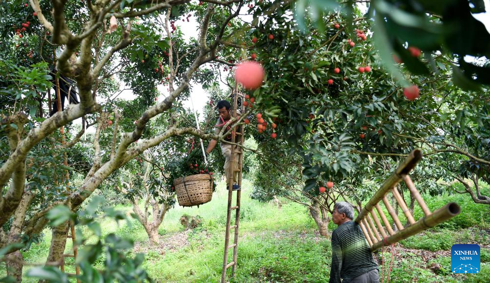 MAOMING, 7 junio, 2025 (Xinhua) -- Imagen del 5 de junio de 2025 de un agricultor recolectando lichis en un jardín de lichis, en la aldea de Baiqiao, en Gaozhou de la ciudad de Maoming, en la provincia de Guangdong, en el sur de China. Enclavada en los exuberantes paisajes del suroeste de la provincia de Guangdong, Gaozhou de la ciudad de Maoming es conocida como la "ciudad natal de los lichis" en China. Maoming es la mayor base de producción de lichi de China, con una superficie de plantación de aproximadamente 1,42 millones de mu (unas 94.667 hectáreas) y una producción anual que representó aproximadamente el 20 por ciento del total del país en 2024. Además de abastecer los mercados nacionales, el lichi de Maoming se exporta a todo el mundo, llegando a países como Rusia, Australia, Tailandia y Japón. (Xinhua/Ding Hongfa)