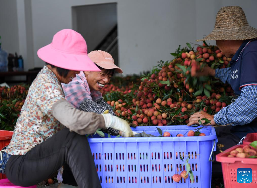 MAOMING, 7 junio, 2025 (Xinhua) -- Imagen del 5 de junio de 2025 de agricultoras seleccionando lichis, en la aldea de Yalong, en Gaozhou de la ciudad de Maoming, en la provincia de Guangdong, en el sur de China. Enclavada en los exuberantes paisajes del suroeste de la provincia de Guangdong, Gaozhou de la ciudad de Maoming es conocida como la "ciudad natal de los lichis" en China. Maoming es la mayor base de producción de lichi de China, con una superficie de plantación de aproximadamente 1,42 millones de mu (unas 94.667 hectáreas) y una producción anual que representó aproximadamente el 20 por ciento del total del país en 2024. Además de abastecer los mercados nacionales, el lichi de Maoming se exporta a todo el mundo, llegando a países como Rusia, Australia, Tailandia y Japón. (Xinhua/Deng Hua)