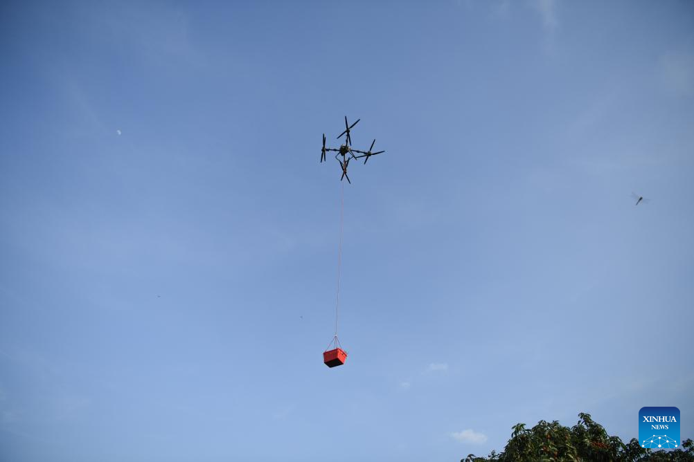 MAOMING, 7 junio, 2025 (Xinhua) -- Imagen del 5 de junio de 2025 de un dron entregando una canasta de lichis en un huerto, en Gaozhou de la ciudad de Maoming, en la provincia de Guangdong, en el sur de China. En medio de la intensa cosecha de lichis frescos en Maoming, conocida como la "ciudad natal de los lichis", se ha adoptado la tecnología de drones en el transporte y la entrega para superar los obstáculos logísticos y garantizar la calidad de la fruta. (Xinhua/Ding Hongfa)