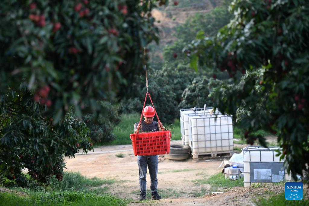 MAOMING, 7 junio, 2025 (Xinhua) -- Imagen del 5 de junio de 2025 de un trabajador cargando una canasta de lichis en un dron en un huerto, en Gaozhou de la ciudad de Maoming, en la provincia de Guangdong, en el sur de China. En medio de la intensa cosecha de lichis frescos en Maoming, conocida como la "ciudad natal de los lichis", se ha adoptado la tecnología de drones en el transporte y la entrega para superar los obstáculos logísticos y garantizar la calidad de la fruta. (Xinhua/Deng Hua)