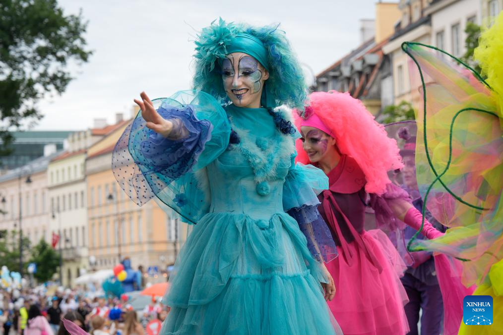 VARSOVIA, 8 junio, 2025 (Xinhua) -- Imagen del 7 de junio de 20254 de una artista bailando durante el Desfile de Sirenas, en Varsovia, Polonia. El desfile que presenta 20 carros alegóricos, se llevó a cabo en la capital polaca el sábado para honrar a la Sirena de Varsovia, un símbolo icónico de la ciudad. (Xinhua/Jaap Arriens)