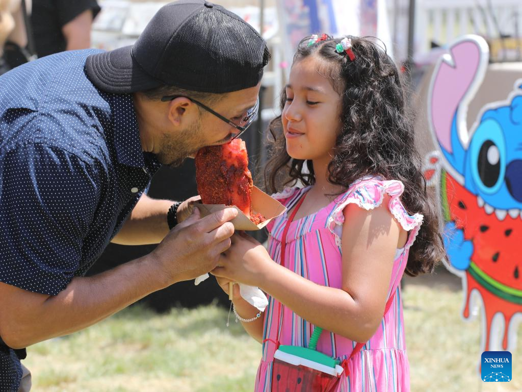 LOS ANGELES, 8 junio, 2025 (Xinhua) -- Imagen del 7 de junio de 2025 de un padre y su hija compartiendo un pedazo de sandía durante el Festival de la Sandía de California 2025 en el Parque de la Presa Hansen, en Los Angeles, California, Estados Unidos. (Xinhua/Qiu Chen)