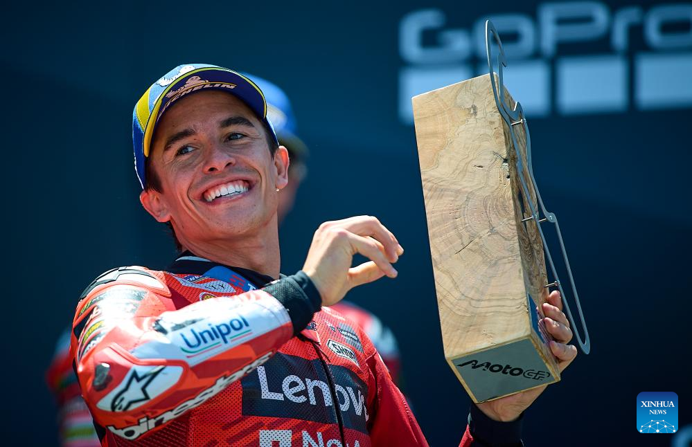 MADRID, 9 junio, 2025 (Xinhua) -- Imagen del 8 de junio de 2025 de Marc Márquez, de Ducati Lenovo, posando en el podio al término del Gran Premio de Aragón de MotoGp, en el circuito de Motorland Aragón, en Alcañiz, España. (Xinhua/Str)