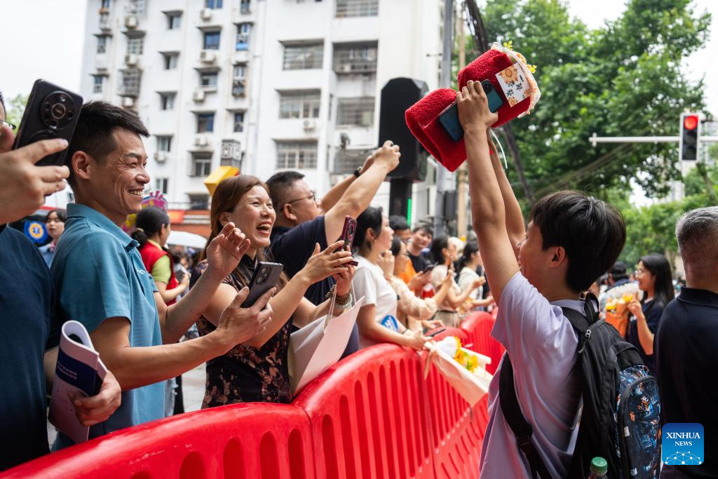 CHANGSHA, 9 junio, 2025 (Xinhua) -- Padres celebran por su hijo (d) después del examen en un sitio del examen nacional de ingreso a la universidad, en Changsha, en la provincia de Hunan, en el centro de China, el 9 de junio de 2025. El examen nacional de ingreso a la universidad de este año, también conocido como gaokao, comenzó el 7 de junio de este año. En algunas regiones, el examen finalizó el lunes. (Xinhua/Chen Sihan)