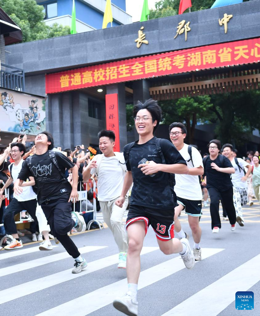 BEIJING, 9 junio, 2025 (Xinhua) -- Estudiantes salen corriendo de un sitio del examen nacional de ingreso a la universidad, en la ciudad de Changsha, en la provincia de Hunan, en el centro de China, el 9 de junio de 2025. El examen nacional de ingreso a la universidad de este año, también conocido como gaokao, comenzó el 7 de junio de este año. En algunas regiones, el examen finalizó el lunes. (Xinhua/Chen Zhenhai)