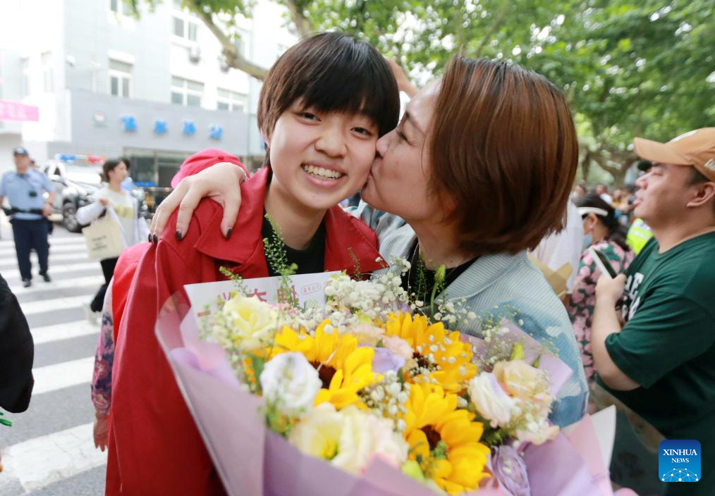 BEIJING, 9 junio, 2025 (Xinhua) -- Una familiar besa a una estudiante después del examen en un sitio del examen nacional de ingreso a la universidad, en la ciudad de Yangzhou, en la provincia de Jiangsu, en el este de China, el 9 de junio de 2025. El examen nacional de ingreso a la universidad de este año, también conocido como gaokao, comenzó el 7 de junio de este año. En algunas regiones, el examen finalizó el lunes. (Xinhua/Meng Delong)