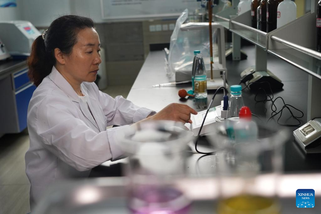 YANCHENG, 9 junio, 2025 (Xinhua) -- Imagen del 7 de junio de 2025 de una empleada probando agua potable después de la desalinización de agua de mar en Jiangsu Fenghai New Energy Seawater Desalination Development Co., Ltd., en Yancheng, en la provincia de Jiangsu, en el este de China. La ciudad de Yancheng ha intensificado sus esfuerzos para desarrollar industrias marinas y promover tecnologías de desalinización de agua de mar, convirtiéndose en un nuevo polo de crecimiento de desarrollo de alta calidad. (Xinhua/Wan Xiang)