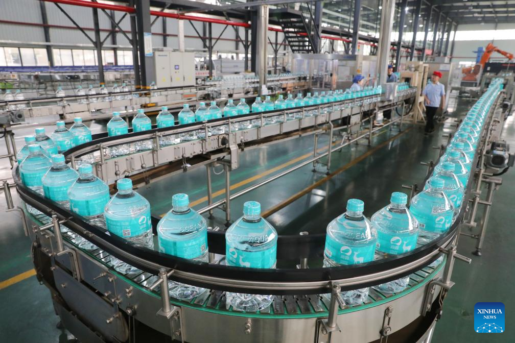 YANCHENG, 9 junio, 2025 (Xinhua) -- Imagen del 7 de junio de 2025 de empleados trabajando en la línea de producción de agua potable embotellada en Jiangsu Fenghai New Energy Seawater Desalination Development Co., Ltd., en Yancheng, en la provincia de Jiangsu, en el este de China. La ciudad de Yancheng ha intensificado sus esfuerzos para desarrollar industrias marinas y promover tecnologías de desalinización de agua de mar, convirtiéndose en un nuevo polo de crecimiento de desarrollo de alta calidad. (Xinhua/Mao Jun)