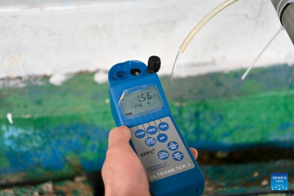 YANCHENG, 9 junio, 2025 (Xinhua) -- Imagen del 7 de junio de 2025 de un empleado probando la conductividad del agua en un taller de desalinización de agua de mar de Jiangsu Fenghai New Energy Seawater Desalination Development Co., Ltd., en Yancheng, en la provincia de Jiangsu, en el este de China. La ciudad de Yancheng ha intensificado sus esfuerzos para desarrollar industrias marinas y promover tecnologías de desalinización de agua de mar, convirtiéndose en un nuevo polo de crecimiento de desarrollo de alta calidad. (Xinhua/Yang Chenguang)