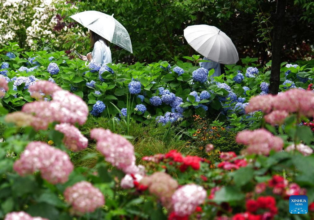 TOKIO, 10 junio, 2025 (Xinhua) -- Turistas registran el florecimiento de flores de hortensia, en Tokio, Japón, el 10 de junio de 2025. (Xinhua/Jia Haocheng)