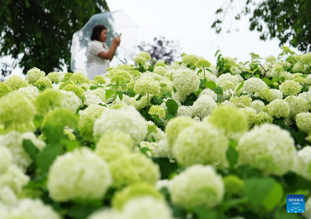 TOKIO, 10 junio, 2025 (Xinhua) -- Una turista registra el florecimiento de flores de hortensia, en Tokio, Japón, el 10 de junio de 2025. (Xinhua/Jia Haocheng)