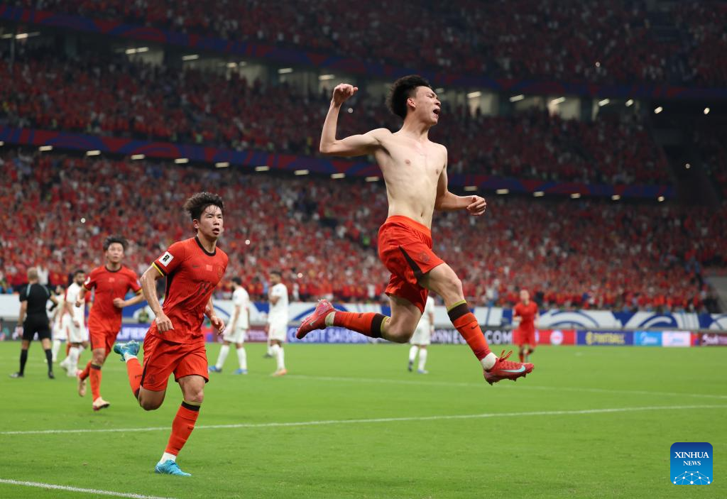 CHONGQING, 10 junio, 2025 (Xinhua) -- Wang Yudong (arriba), de China, festeja su anotación durante el partido del Grupo C de las eliminatorias asiáticas para la Copa Mundial de la FIFA 2026 entre China y Bahréin, en Chongqing, en el suroeste de China, el 10 de junio de 2025. (Xinhua/Hu Xingyu)