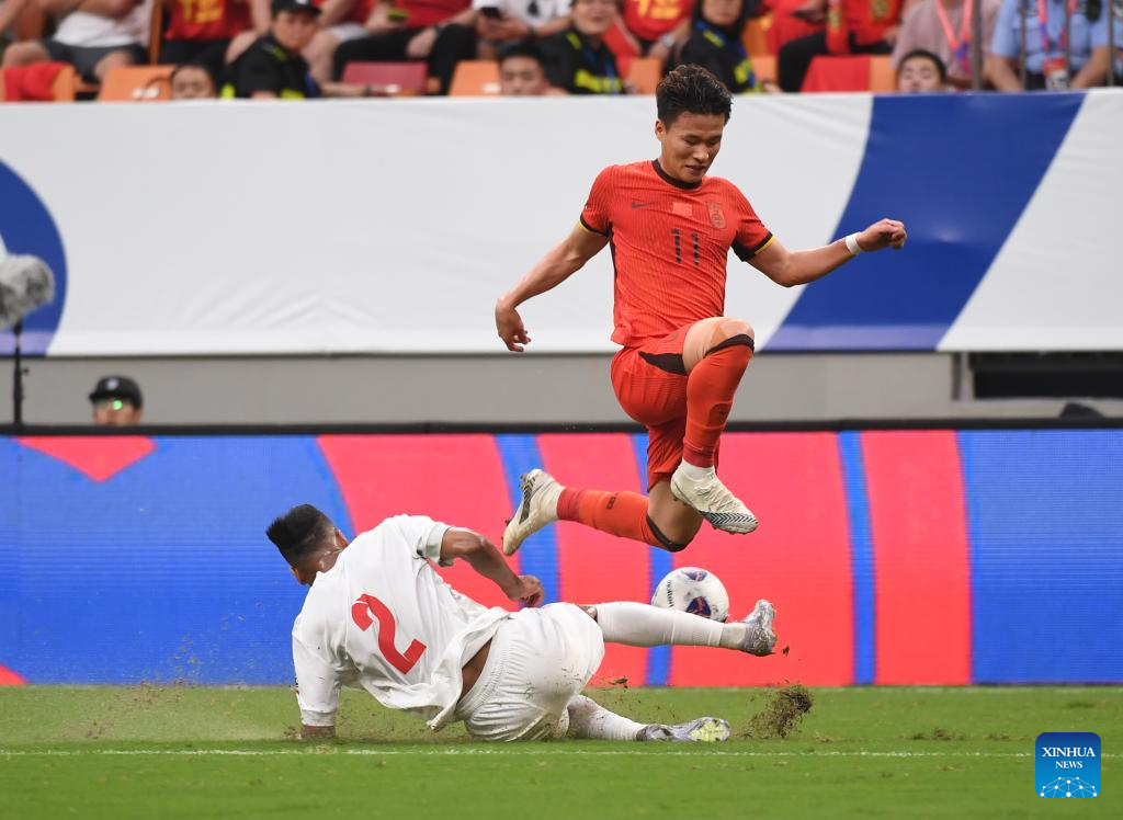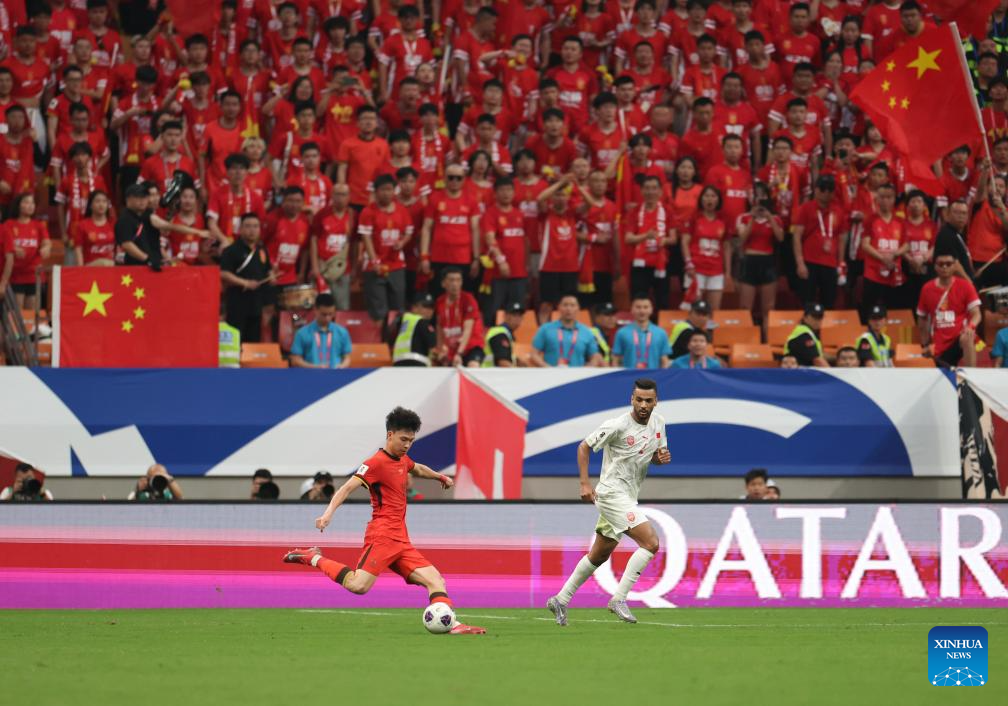 CHONGQING, 10 junio, 2025 (Xinhua) -- Wang Yudong (i), de China, compite durante el partido del Grupo C de las eliminatorias asiáticas para la Copa Mundial de la FIFA 2026 entre China y Bahréin, en Chongqing, en el suroeste de China, el 10 de junio de 2025. (Xinhua/Huang Wei)