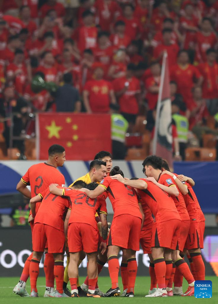 CHONGQING, 10 junio, 2025 (Xinhua) -- Jugadores de China se reúnen durante el partido del Grupo C de las eliminatorias asiáticas para la Copa Mundial de la FIFA 2026 entre China y Bahréin, en Chongqing, en el suroeste de China, el 10 de junio de 2025. (Xinhua/Huang Wei)