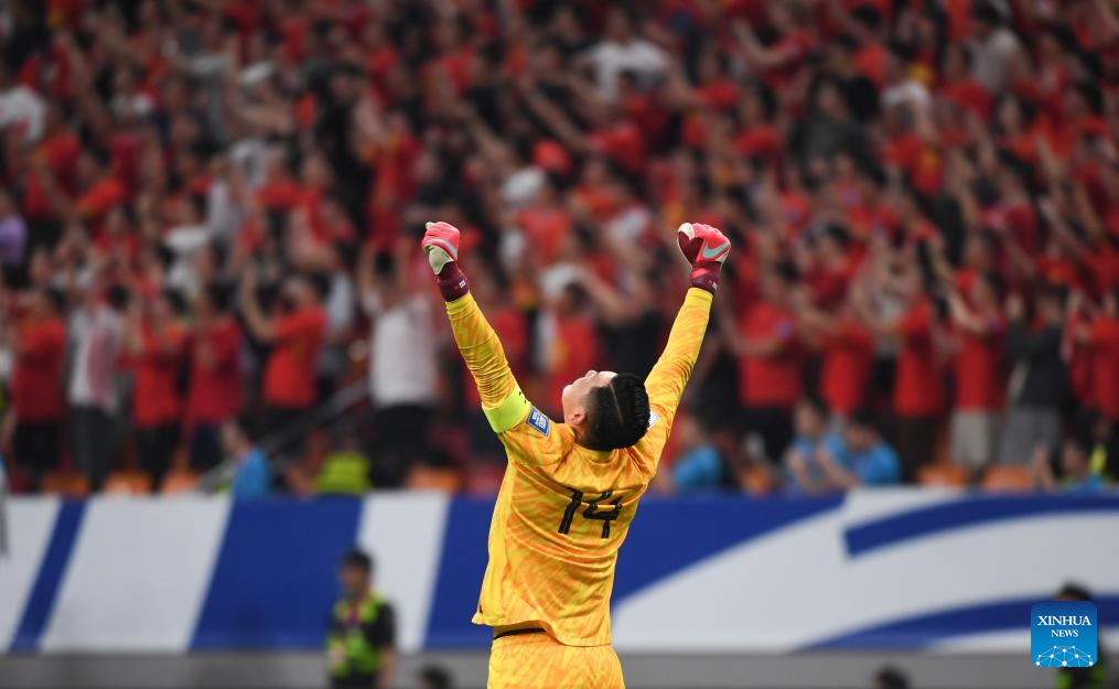 CHONGQING, 10 junio, 2025 (Xinhua) -- El guardameta Wang Dalei, de China, festeja durante el partido del Grupo C de las eliminatorias asiáticas para la Copa Mundial de la FIFA 2026 entre China y Bahréin, en Chongqing, en el suroeste de China, el 10 de junio de 2025. (Xinhua/Chen Cheng)