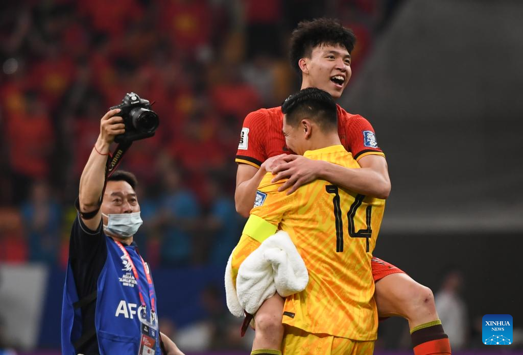 CHONGQING, 10 junio, 2025 (Xinhua) -- Wang Yudong (arriba), de China, festeja la victoria con el guardameta Wang Dalei al término del partido del Grupo C de las eliminatorias asiáticas para la Copa Mundial de la FIFA 2026 entre China y Bahréin, en Chongqing, en el suroeste de China, el 10 de junio de 2025. (Xinhua/Chen Cheng)